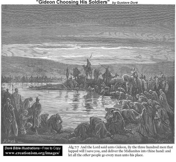 - The famous scene of God reducing his army to a mere 300 men, telling Gideon to cull all those who knelt and lapped water from a stream, rather than using his hand to bring the water to his mouth.