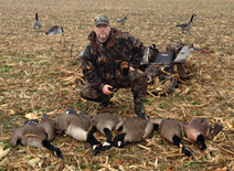 The morning of this corn field hunt found us wet from the cold drizzle. But we stuck it out in anticipation of hungry geese arriving like they had several days in a row. Except this day, we were waiting on them with some fine looking decoys. We even had a decoy that flaps its wings, making them think a live goose is surely in that field! Our blinds blended perfectly with the corn, allowing us to lie down on our backs in the middle of some phony geese, in hopes of fooling some real geese. And our calls imitated the sounds of live geese very closely.
